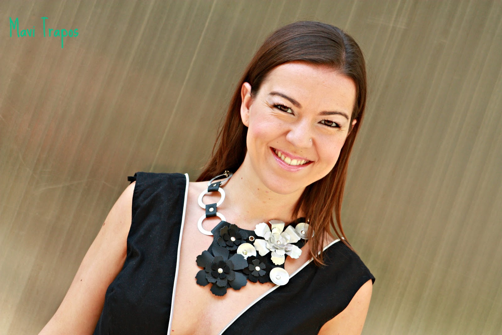 Siempre me ha encantado llevar collares largos o tipo babero pero desde hace unos años, tengo problemas en las cervicales, demasiadas horas de ordenador y de conducción pasan factura y es un problema a la hora de elegir complementos. Este collar, realizado en aluminio y piel no pesa nada, es muy cómodo y favorecedor.