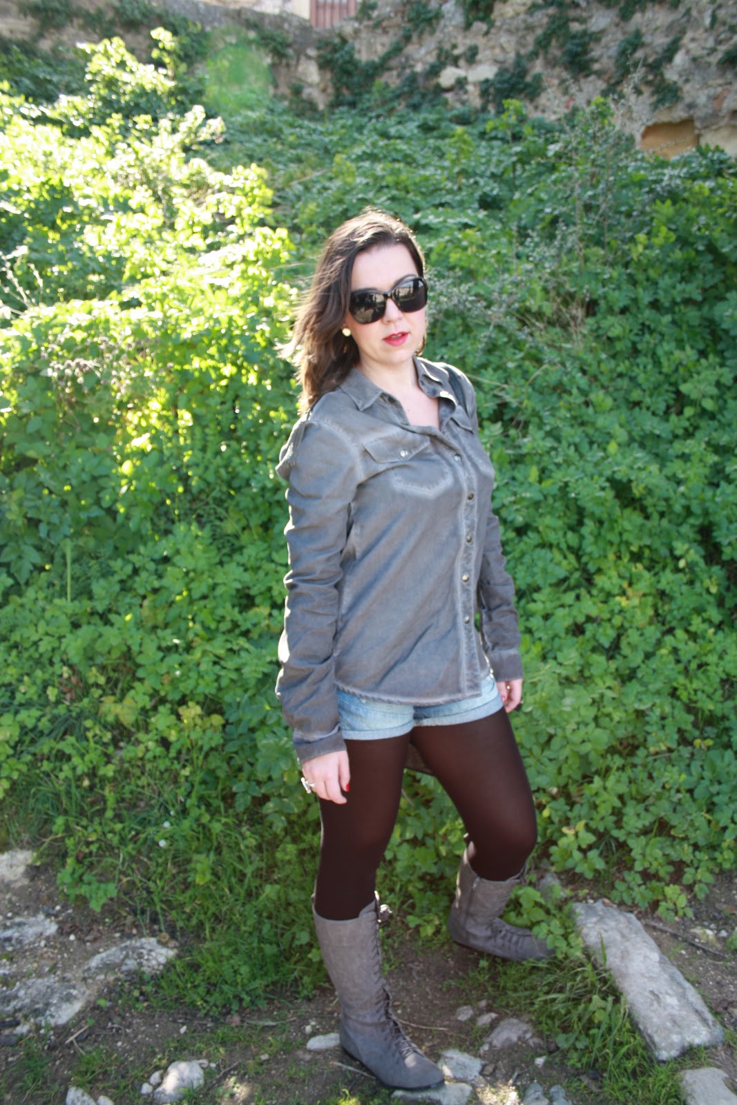 El outfit elegido, cómodo y actual: unos shorts vaqueros, una camisa denim en gris y unas botas grises.