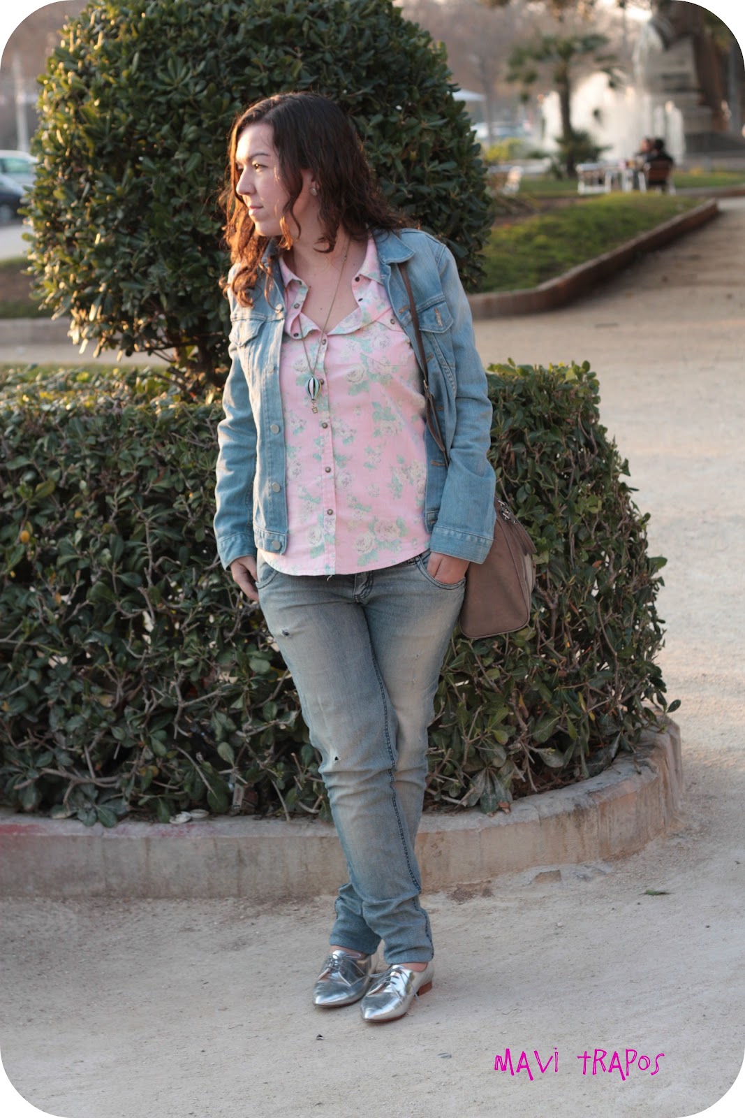 Para terminar el look, dos tendencias más: los zapatos metalizados de Zara y la camisa vaquera con estampado floral (que me encanta) de Mango. Llevo vaqueros de Zara, cazadora de Levi’s, mariposa de Oysho y colgante de Él Ópalo Rojo.