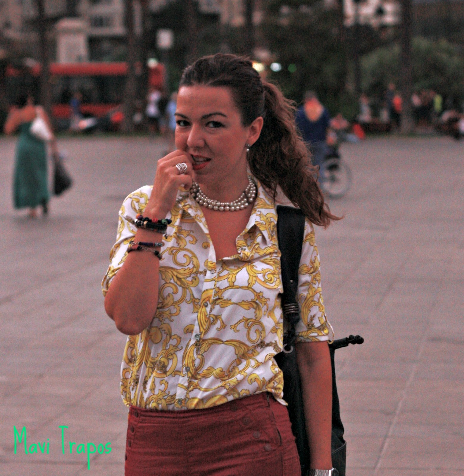 Esta camisa estilo Versace es de Cortefiel y la llevo con pantalones segunda piel de Pull and Bear (ya los viste AQUI con mis Sneakers clon de Isabel Marant) zapatos de Cortefiel, bolso de Zara y collar de perlas de Hoss Intropia.