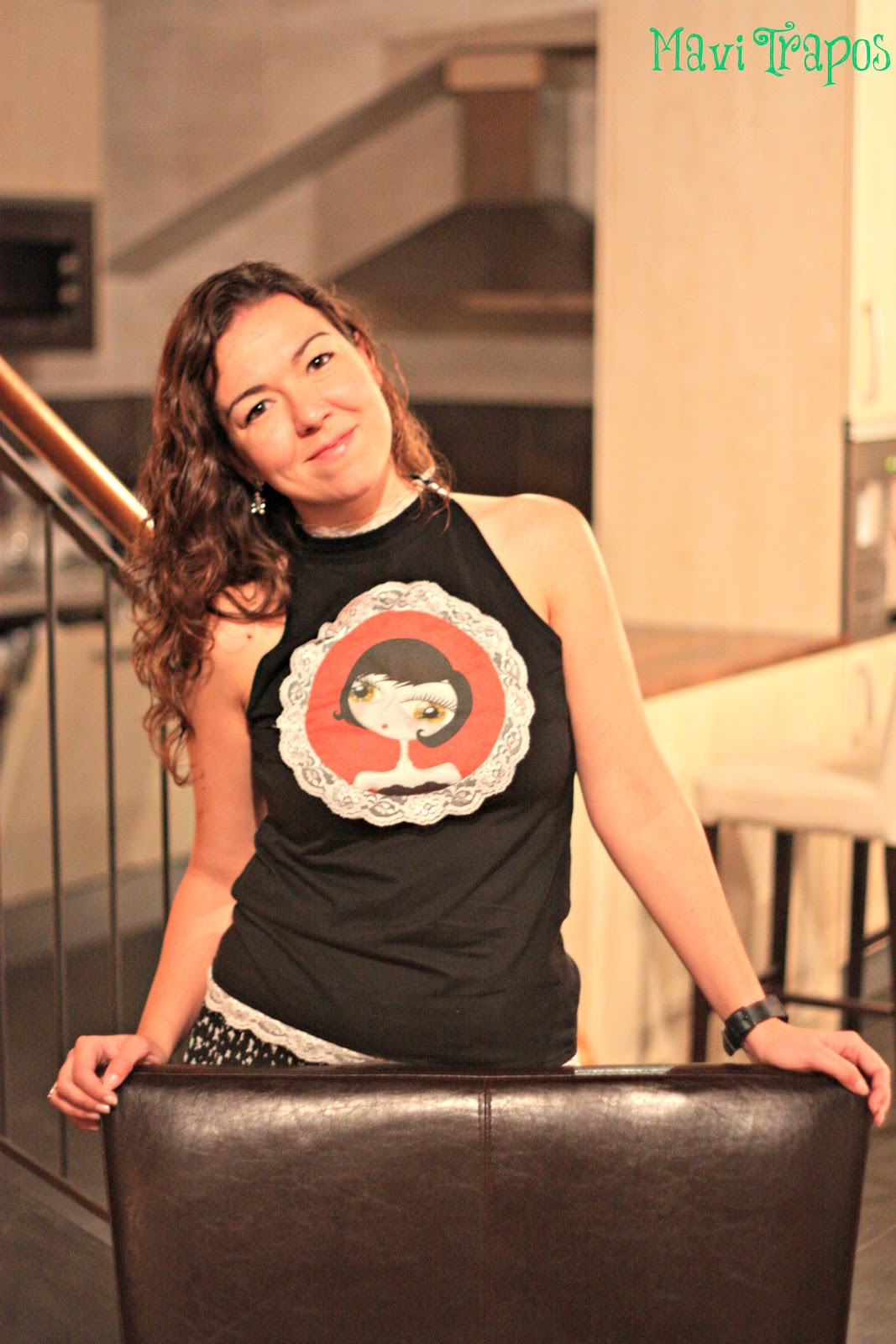 El top es una monería en sí, no solo por el dibujo que claramente lo es todo, también por la delicadeza que le da la puntilla que rodea la imagen, el cuello y la parte de bajo. Pero es que todos los trabajos de Esther son así, delicados y finos y además originales, te dejo un enlace a su web AQUI y a su blog AQUI para que veas las fundas de móvil que tiene, los bolsos o los conjuntos de collares, anillos y pendientes… Además, también hace unos retratos chulísimos!