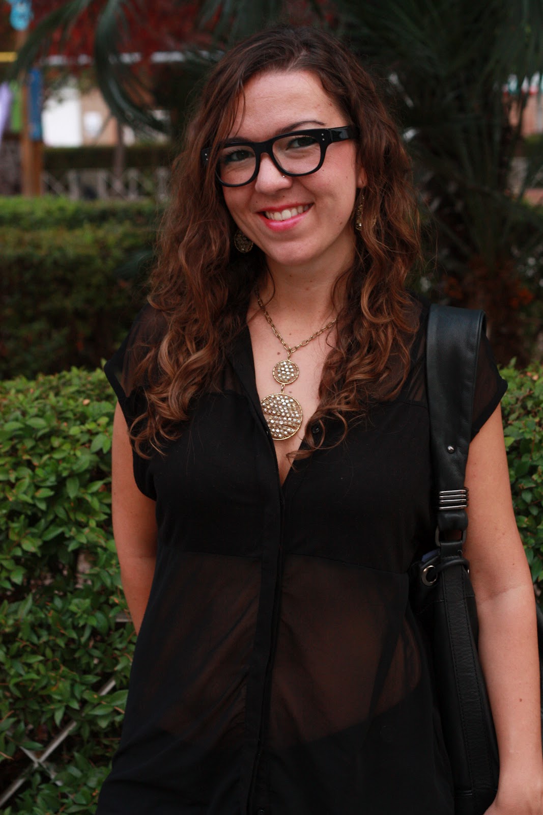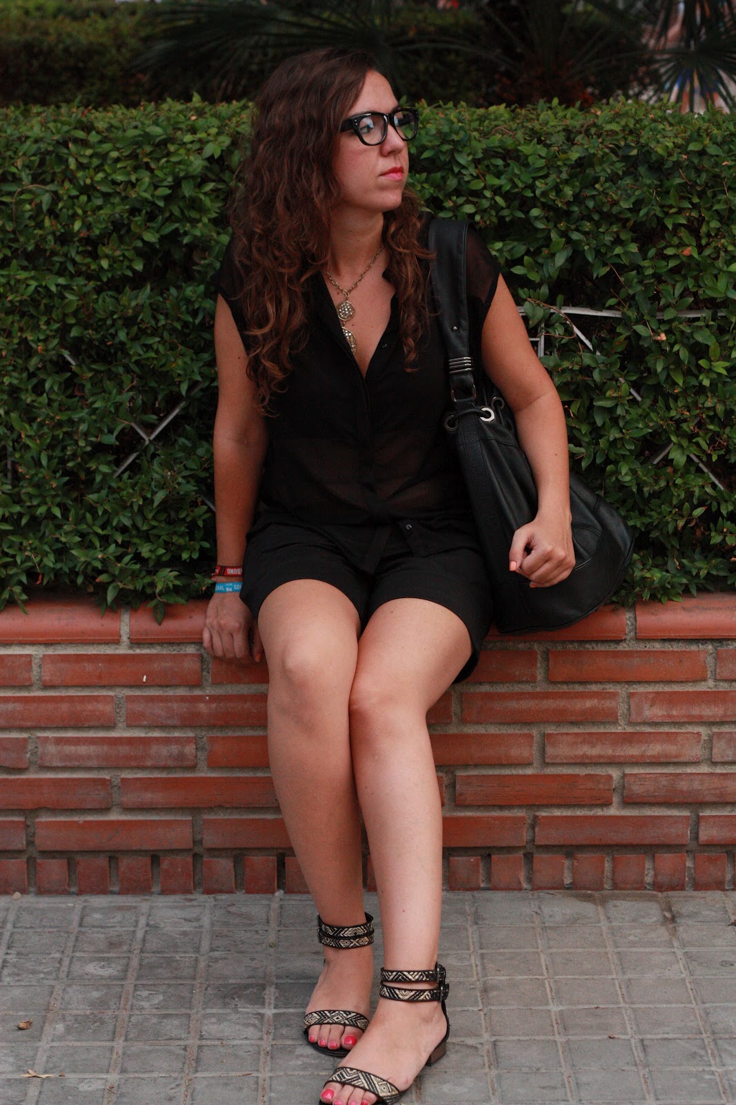 Las llevo con bolso y camisa semi transparente de Zara, un short de H&M, sandalias étnicas de Pull and Bear y colgante y pendientes dorados de Los Complementos de María