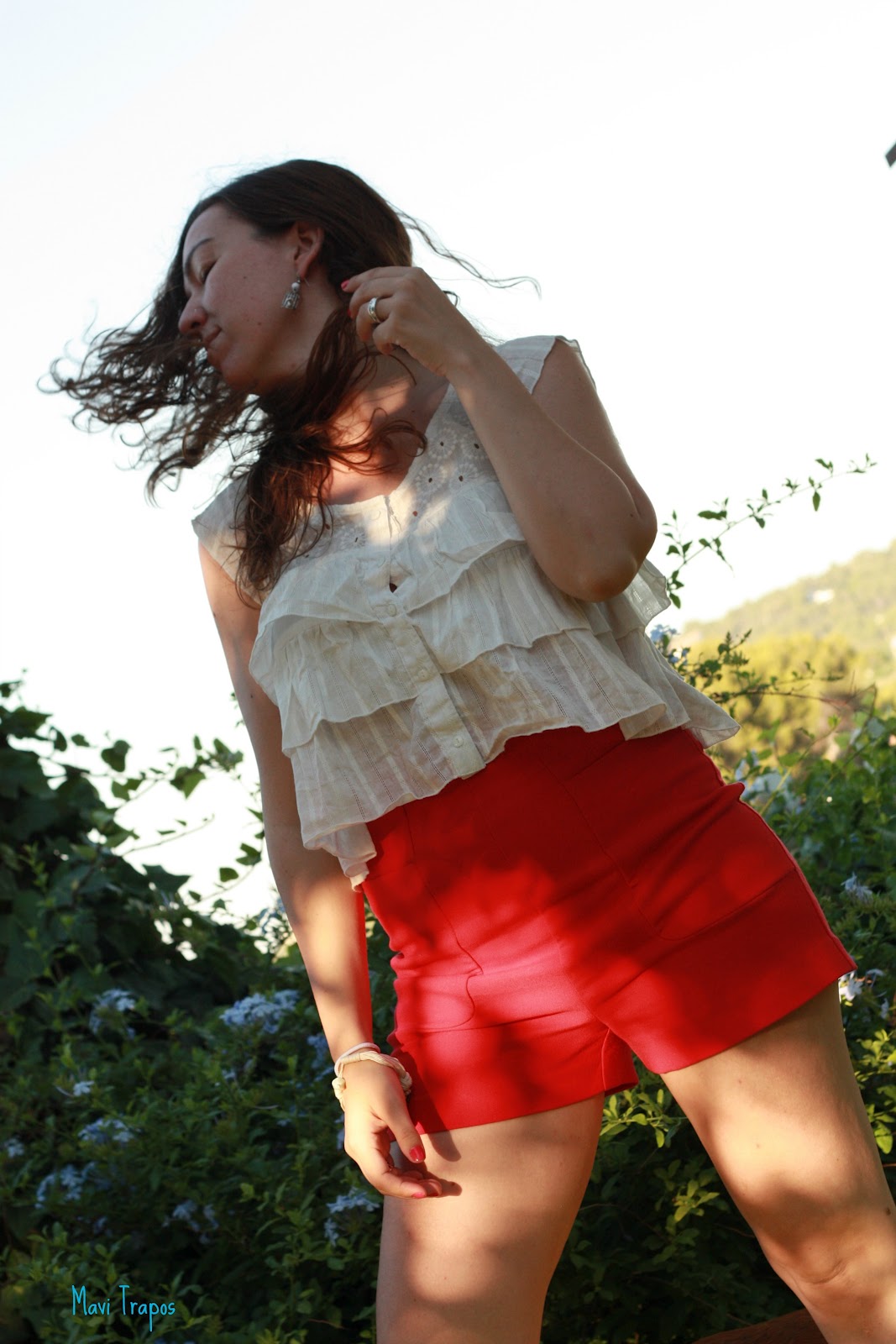 Así que como en boca cerrada no entran moscas, solo te digo que llevo top de volantes de Vero Moda, shorts coral de talle alto de H&M y sandalias de Cortefiel.