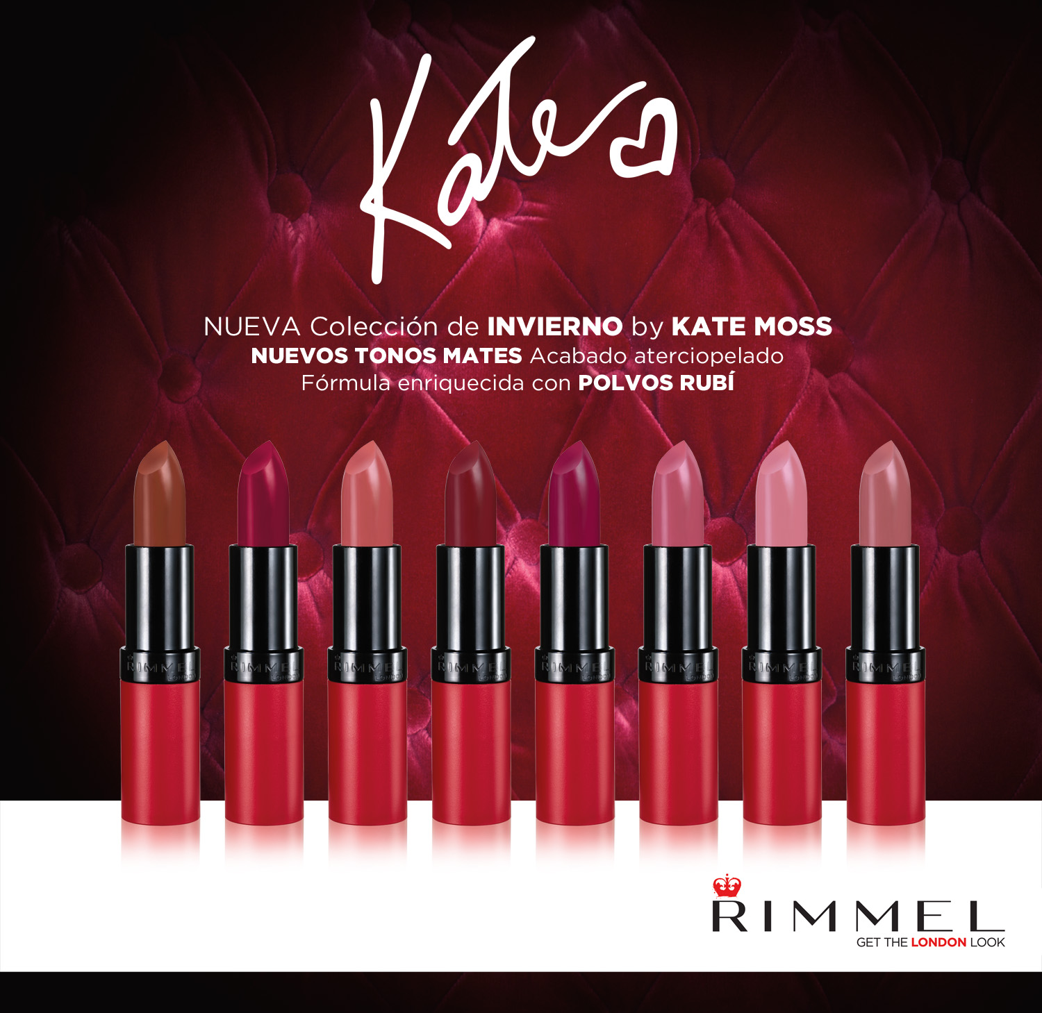Esta vez son con un acabado mate pero no por ello resecan o dejan un tono apagado en los labios, además, incorporan polvo de rubí, para intensificar los colores. Donde se ve la marca inconfundible de la modelo es en el packing, un rojo mate con su firma en negro brillante y la corona en relieve de Rimmel.