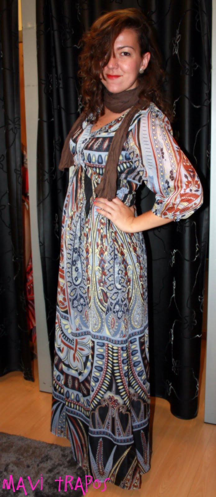 Empiezo con este vestido largo de aires Boho Chic en rojo y en azul, con un corte ancho muy favorecedor, escote marcado y un estampado precioso, ideal por su manga tres cuartos tanto para las noches de veranito que nos quedan como para estos meses próximos, además queda genial con un pañuelo al cuello.