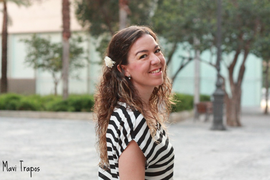 Qué guapa! Te queda preciosa la flor en el pelo y me encanta cómo queda la falda cn la camiseta de rayas.
