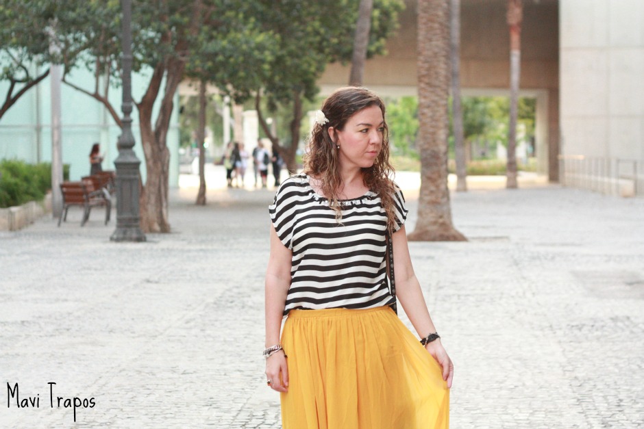 Me gusta mucho cómo has combinado las rayas con el amarillo de la falda. Saludos, Amparo http://fanofstylebyamparo.blogspot.com.es/