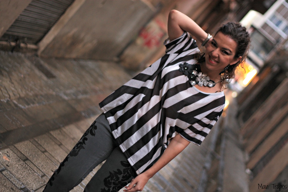 Llevo camiseta de rayas en blanco y negro (como la portada de Harper’s Bazaar de este mes!!) y pantalones con flores bordadas (me encanta este toque chic a juego con el collar) de la nueva temporada de H&M, los zapatos también son de H&M pero de hace unos años, el collar es de by Phillip Eckert y la perfecto roja es de Miss Sixty.