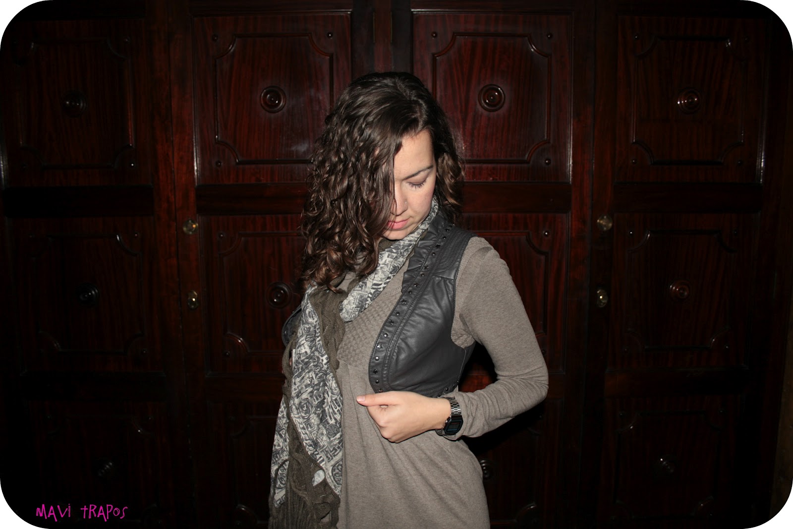 Llevo vestido de Fórmula Joven, chaleco con tachuelas de Only One, bufanda de una tienda local, cazadora de cuero de Cortefiel y pendientes de Tous.