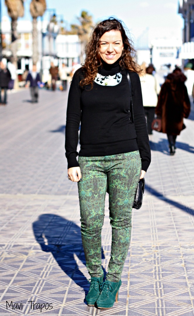 Llevo: un suéter de cuello alto y pantalones verdes (estoy obsesionada, lo se) con estampado barroco y bolso de Zara, tacones de Azarey y el collar babero más bonito y original del mundo ;P, de by Phillip Eckert aunque hay quien me dice que prefiere el de flores AQUI ¿tú con cual te quedas?