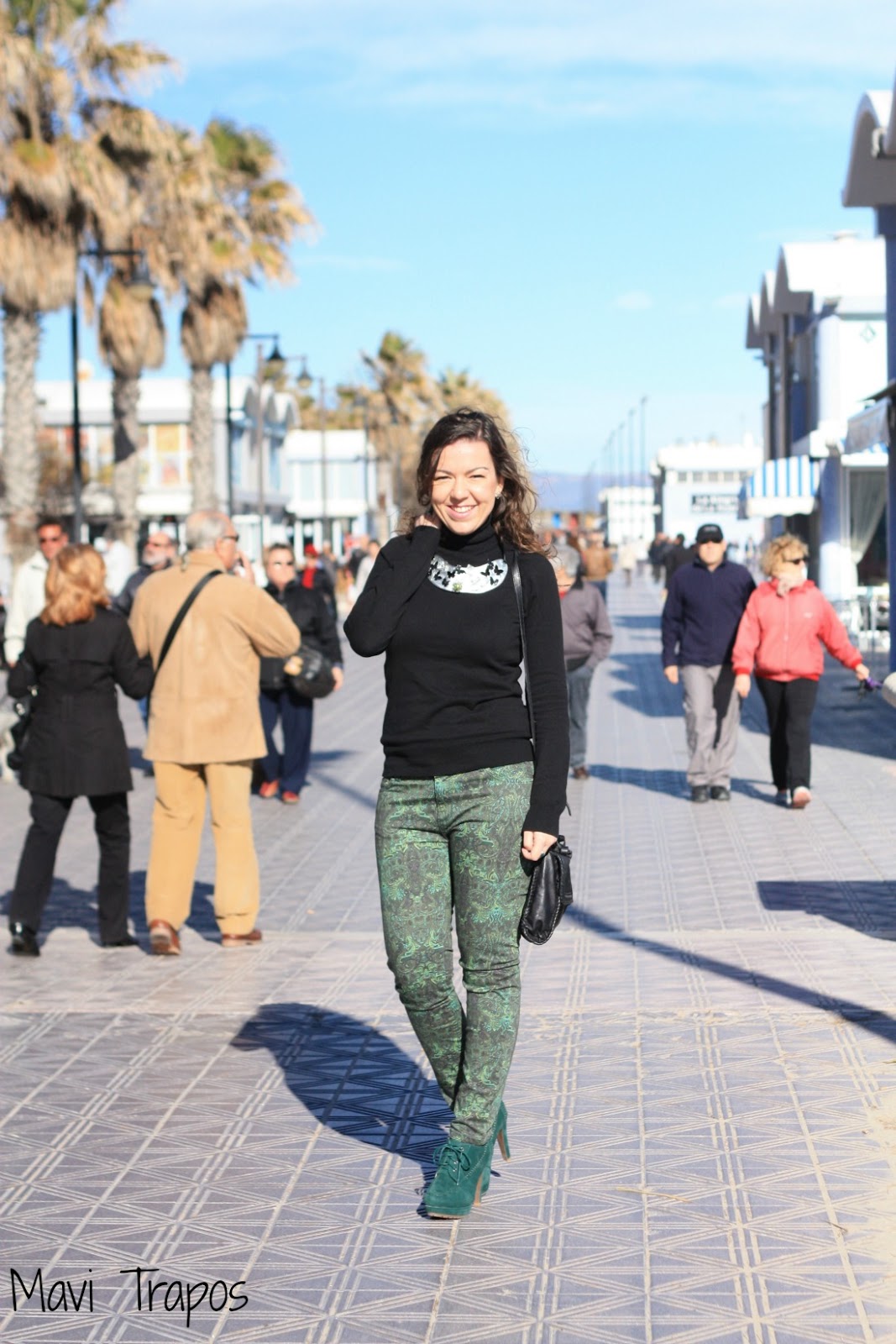 Me encanta el print de esos pantalones! Y el toque que le da el collar a ese jersey basico. Apuesta segura este año por el verde, color de la temporada.